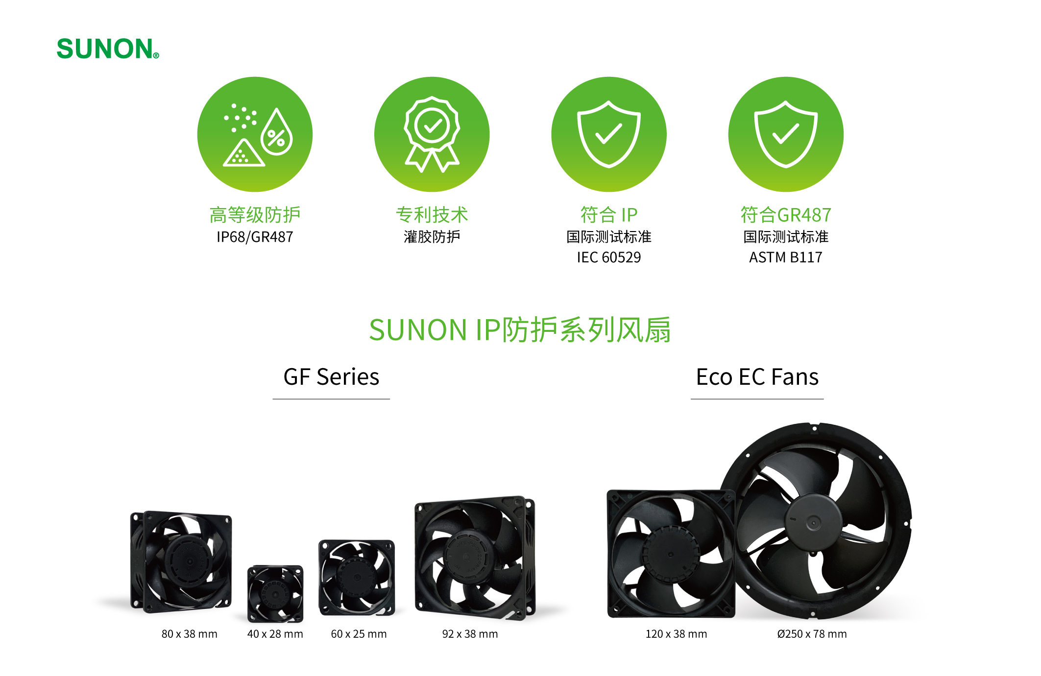 面臨越來越劇烈的全球環(huán)境變化,SUNON創(chuàng)新開發(fā)「最高防塵防水IP 68風(fēng)扇&耐鹽霧GR487風(fēng)扇」: GF系列目前已推出3個(gè)尺寸:40x40x28、60x60x25、92x92x38 mm,還有即將上市的80x80x38mm耐鹽霧系列,更多尺寸將陸續(xù)發(fā)行,以專利灌膠馬達(dá)防護(hù)技術(shù)(中國發(fā)明專利ZL 2013 1 0481929.6/2014 1 0022982.4)完整包覆整顆馬達(dá),可有效防護(hù)馬達(dá)隔絕灰塵、水、鹽霧等物質(zhì),讓風(fēng)扇不論在沙漠、極地、高山、海邊等惡劣環(huán)境下可長時(shí)間穩(wěn)定運(yùn)作,提供高效能的散熱,展現(xiàn)SUNON領(lǐng)先業(yè)界的產(chǎn)品競爭力。